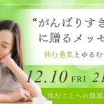 2025年9月12日 / 最終更新日 : 2025年9月12日 児島佐予子 メンタル・自己成長を学ぶセミナー 【12/12】“がんばりすぎママ”に贈る、ゆるむ勇気と休むチカラ ちゃんとしてるのに、なんで私はこんなに疲れてるんだろう? 仕事も、育児も、家のことも。どれも大事だから、つい手を抜けない。まわりはどんどん進んでいるように見えて、自分だけ立ち止まるのが怖くなる。「ちゃんと休んだほうがいい […]