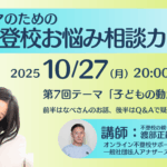 2025年9月1日 / 最終更新日 : 2025年9月1日 渡部正嗣 子育て・教育を学ぶセミナー 【10/27】ママのための不登校お悩み相談カフェ NO.7 開催日:2025年10月27日 開始時間:20時00分 不登校ママのためのプチセミナー「不登校お悩み相談カフェ」へようこそ! 子どもが不登校に。。。 どうしたら良いかもわからず、真っ暗な闇の中を手探りでさまよい歩くよ […]