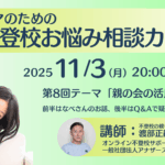 2025年9月1日 / 最終更新日 : 2025年9月1日 渡部正嗣 子育て・教育を学ぶセミナー 【11/3】ママのための不登校お悩み相談カフェ NO.8 開催日:2025年11月3日 開始時間:20時00分 不登校ママのためのプチセミナー「不登校お悩み相談カフェ」へようこそ! 子どもが不登校に。。。 どうしたら良いかもわからず、真っ暗な闇の中を手探りでさまよい歩くよう […]