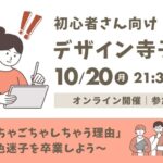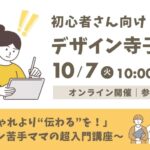 2025年9月4日 / 最終更新日 : 2025年9月4日 児島佐予子 仕事・起業を学ぶセミナー 【10/7】初心者さん向けデザイン寺子屋① 「おしゃれより伝わるを!」〜デザイン苦手ママの超入門講座〜 「なんか、ダサい気がするけど…どう直せばいいか分からない」「Canvaは使えるけど、自信が持てない」「デザインが苦手。できればやりたくない…」 そんな気持ちで、 […]