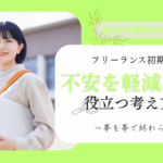 2025年10月2日 / 最終更新日 : 2025年10月6日 今井奈保美 セルフマネジメント・メンタル フリーランス初期段階で不安を軽減するために役立つ考え方と習慣 不安を感じるのは自然なこと フリーランスとして一歩を踏み出したばかりの頃、「本当にやっていけるのかな…」と不安になるのはとても自然なことです。収入の不安定さ、仕事が取れるかどうか、孤独感など、初期段階ではさまざまな悩みが […]