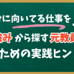 2025年10月26日 / 最終更新日 : 2025年10月26日 内田琢也 働き方・キャリア 自分に向いてる仕事を強みから探す元教員のための実践ヒント 教員を辞めたあと、「自分に向いてる仕事がわからない…」と感じていませんか?長年、教育という特別な世界で頑張ってきたからこそ、いざ外に出ると“自分の価値”が見えづらくなるものです。でも大丈夫。あなたの中には、すでにたくさん […]