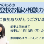 2025年10月2日 / 最終更新日 : 2025年10月2日 渡部正嗣 活動日記 【開催報告】120名を超えるご参加 ありがとうございました! 「ママのための不登校お悩み相談カフェ」前半4回を終了!後半は10月13日スタートです! 不登校の親を経験した元校長、なべです。 毎週月曜日の夜8時から開催している「ママのための不登校お悩み相談カフェ(ママカフェ)」は […]