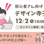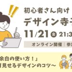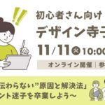2025年9月4日 / 最終更新日 : 2025年9月4日 児島佐予子 仕事・起業を学ぶセミナー 【11/11】初心者さん向けデザイン寺子屋③ 「文字で“伝わらない”原因と解決法」 〜フォント迷子を卒業〜 「自分では読みやすいと思ったのに、なんかゴチャついて見える」「テンプレを使っても、しっくりこない」 そんなふうに感じたことはありませんか?実は、文字まわりが整 […]