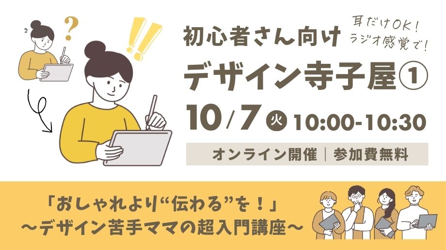 次回は10月7日(月)の10:30~より「「おしゃれより“伝わる”を!~デザイン苦手ママの超入門講座~」と題しまして、全5回の「デザイン寺子屋」を実施いたします!デザインの超基礎を一緒に学びながら、質問にもお答えできるアットホームな時間にしたいと思いますので、皆様、ぜひお気軽に遊びにお越しください✨