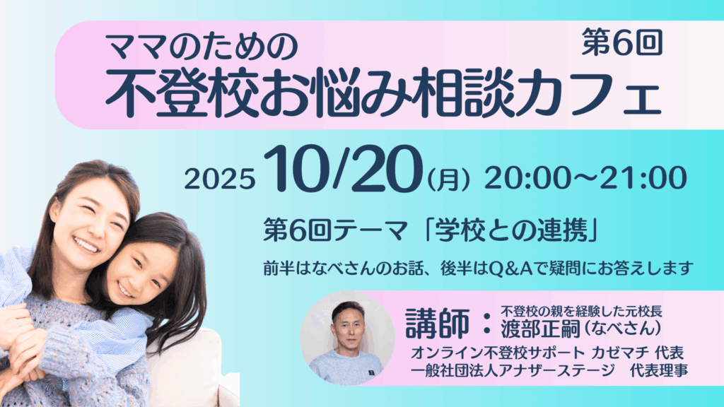 子育て・教育を学ぶセミナー2025年9月1日【10/20】ママのための不登校お悩み相談カフェ NO.6
