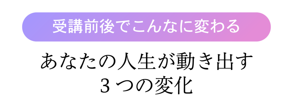 受講前: 「やりたいことがあっても不安で行動できない」「SNS を見ては落ち込む」「将来が不安で眠れない」といった状態から、受講後: 「自分の軸がはっきりして迷わない」「他人と比較せず自分のペースで進める」「具体的な行動プランがあるから不安がない」という状態に変わります。